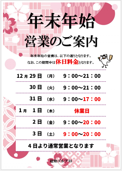 12月15日(月)より冬期営業となり、閉店時間が1時間早く21:00までとなります。
